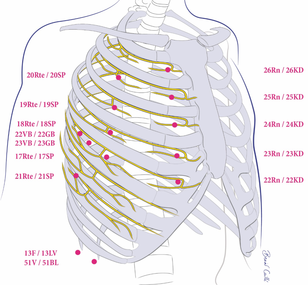 Clinical applications: thoracic pain, sequelae from rib trauma or fracture, intercostal neuralgia and sequelae of shingles, organic correlations (heart, lungs, stomach, liver), etc.